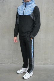 The bottom of the tracksuit is matched with a full zip hoodie, providing a snug fit and added warmth during colder weather. The full zip design also allows for easy on and off, making it convenient for the wearer.