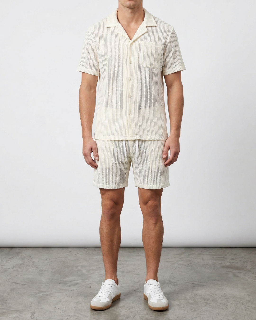 Bring high-definition texture to your vacation wardrobe with the Aero-Wave Co-ord Set. This matching duo is crafted from a premium, lightweight fabric featuring a unique vertical-ribbed "wave" texture that provides built-in ventilation and a modern, tactile finish. The short-sleeve shirt is designed with a relaxed Cuban collar and a sharp chest pocket, offering a sophisticated "quiet luxury" aesthetic that transitions effortlessly from beachside brunch to evening nights.