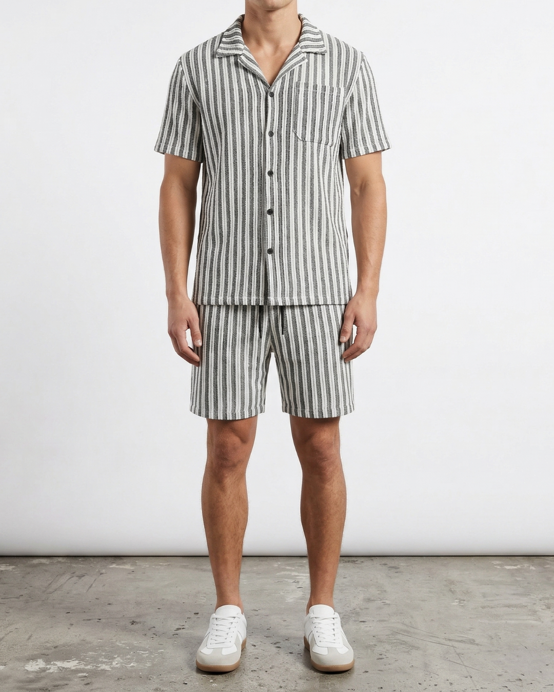Bring high-definition texture to your vacation wardrobe with the Aero-Wave Co-ord Set. This matching duo is crafted from a premium, lightweight fabric featuring a unique vertical-ribbed "wave" texture that provides built-in ventilation and a modern, tactile finish. The short-sleeve shirt is designed with a relaxed Cuban collar and a sharp chest pocket, offering a sophisticated "quiet luxury" aesthetic that transitions effortlessly from beachside brunch to evening nights.