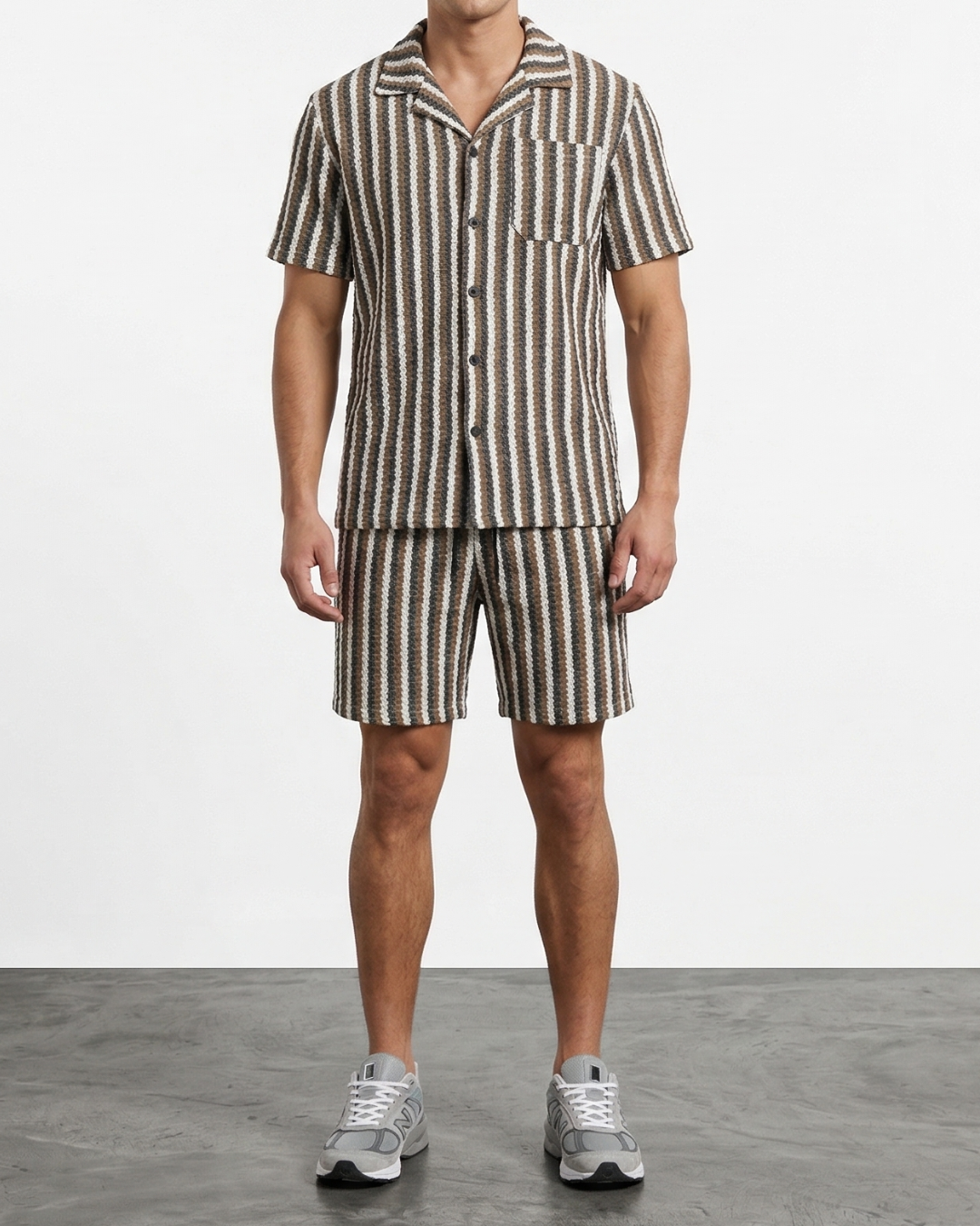 Make a bold style statement this season with the Linear-Block Co-ord Set, designed for those who appreciate high-impact texture and effortless coordination. This matching set is crafted from a premium, multi-dimensional seersucker-style fabric that features a unique vertical "ripple" texture, offering superior breathability and a modern tactile finish. The short-sleeve shirt is tailored with a relaxed Cuban collar and a structured chest pocket, creating a sharp, vacation-ready look that works for coastal getaways or urban summer outings.