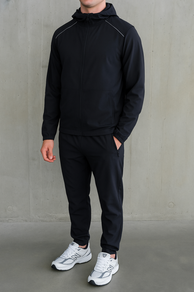 Stay sharp and comfortable in this sleek all-grey tracksuit, crafted from heavyduty, quick-dry nylon. The full-zip hooded jacket and matching tapered joggers deliver a modern, athletic silhouette, perfect for both active days and laid-back weekends. Subtle reflective piping adds a stylish edge while enhancing visibility. Secure zip pockets keep your essentials safe on the move, and elastic cuffs provide a fitted, streamlined look.