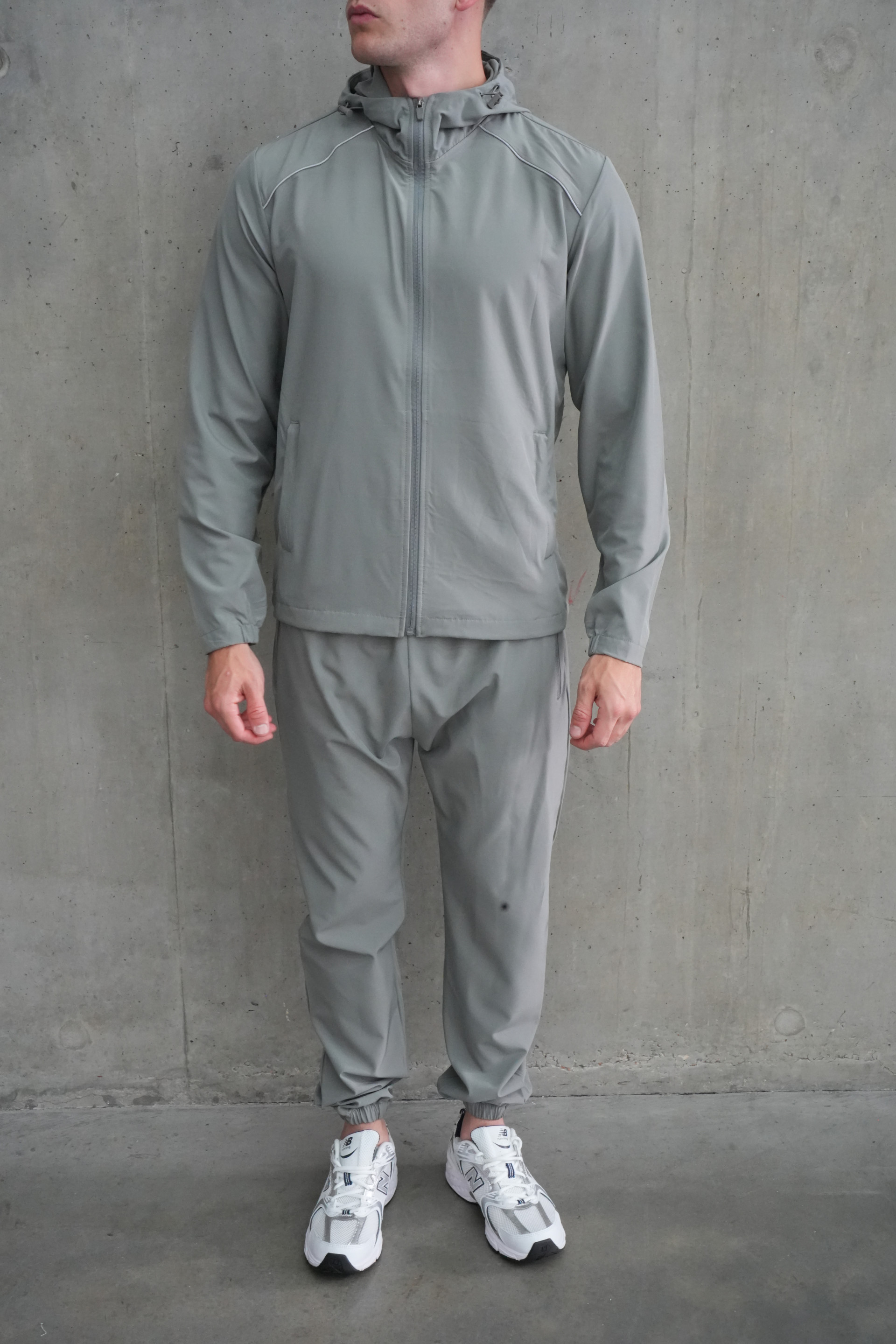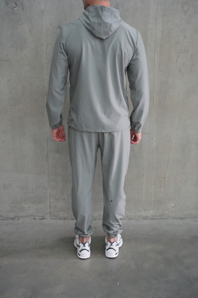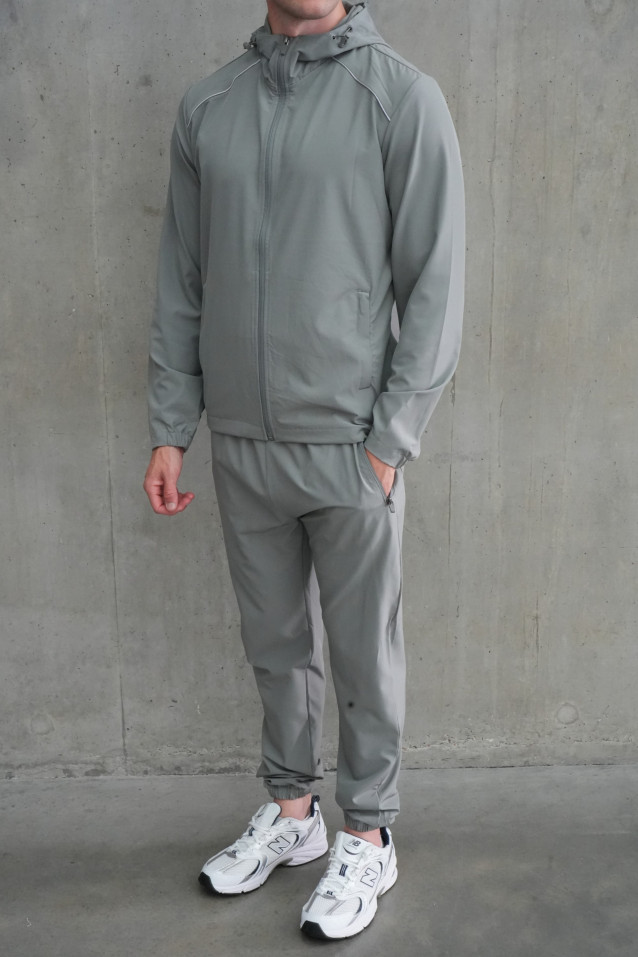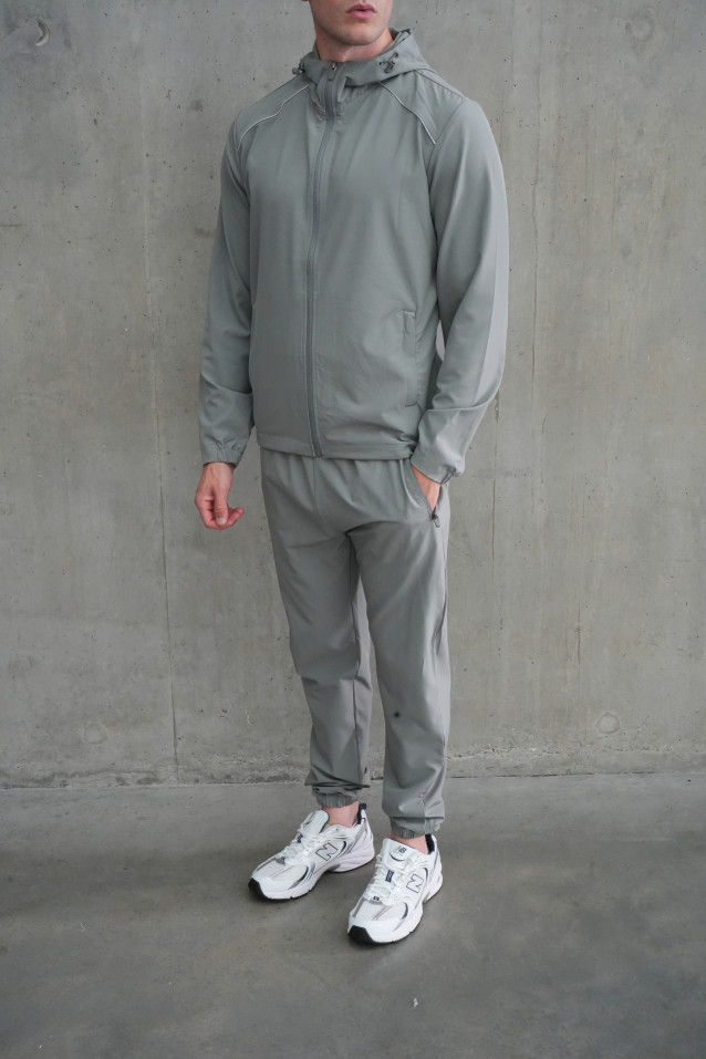 Stay sharp and comfortable in this sleek all-grey tracksuit, crafted from heavyduty, quick-dry nylon. The full-zip hooded jacket and matching tapered joggers deliver a modern, athletic silhouette, perfect for both active days and laid-back weekends. Subtle reflective piping adds a stylish edge while enhancing visibility. Secure zip pockets keep your essentials safe on the move, and elastic cuffs provide a fitted, streamlined look.