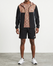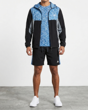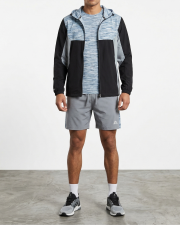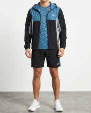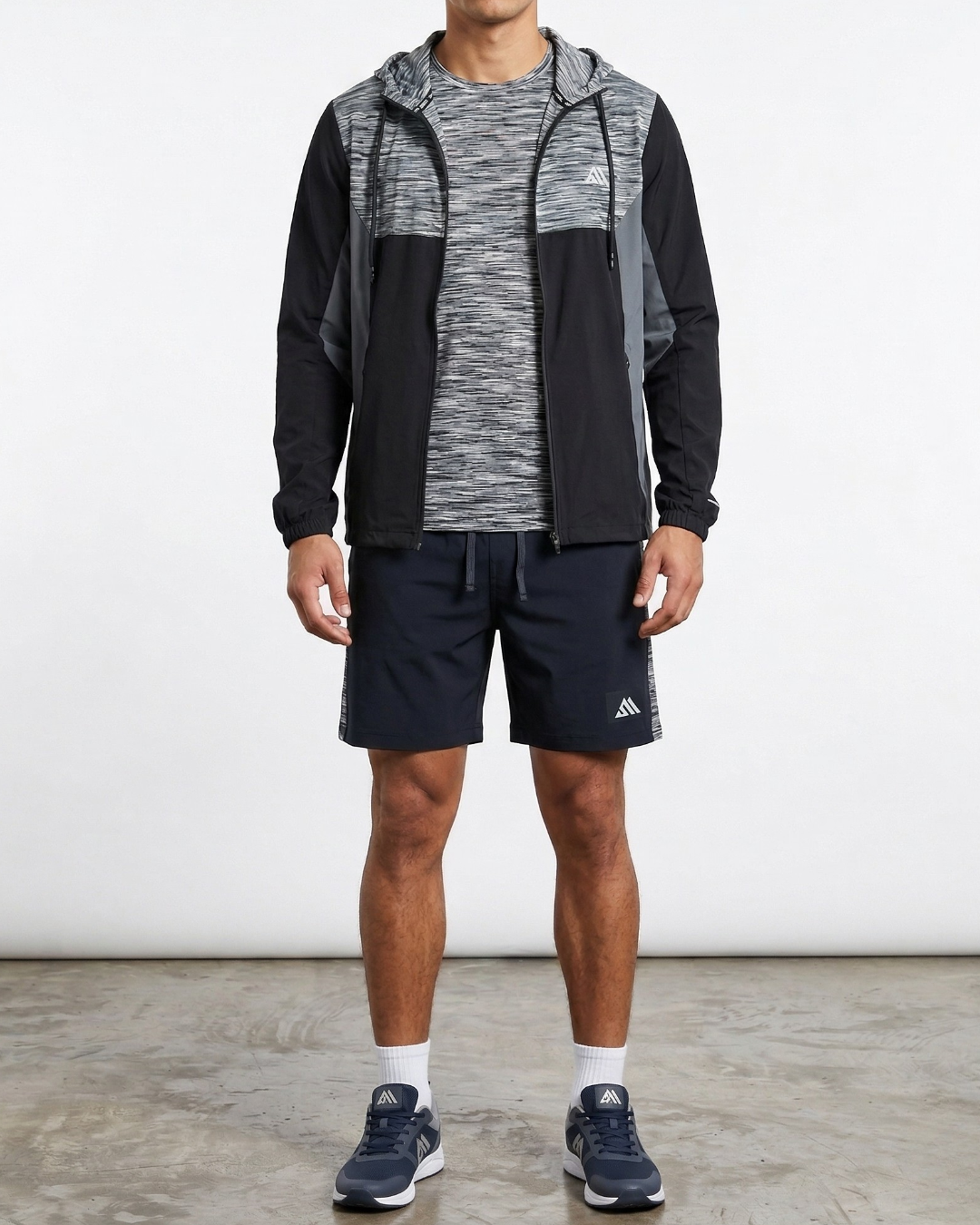 This comprehensive training kit provides a complete outfitting solution for various sporting activities by including a coordinated windbreaker, performance T-shirt, and athletic shorts. The set features a modern, textured space-dye pattern on the upper panels of the jacket and throughout the T-shirt for a dynamic design. For functional outerwear, the full-zip windbreaker includes a protective hood with adjustable drawstrings and secure zippered side pockets. The comfortable bottoms consist of lightweight shorts with an elastic waistband and drawstring for a personalised fit, accented by side paneling that matches the rest of the set. This athletic gear is available in multiple colorways, including Lime Green, Electric Blue, Royal Purple, Slate Grey, Navy Blue, and White. Each piece is finished with minimalist mountain-style athletic branding on the chest and thigh. Constructed from lightweight, moisture-wicking performance fabric in an athletic fit, this set is best suited for running, gym training, hiking, or casual athleisure.