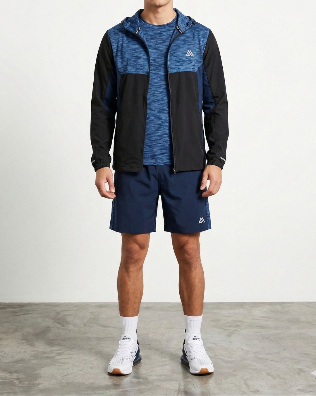 This comprehensive training kit provides a complete outfitting solution for various sporting activities by including a coordinated windbreaker, performance T-shirt, and athletic shorts. The set features a modern, textured space-dye pattern on the upper panels of the jacket and throughout the T-shirt for a dynamic design. For functional outerwear, the full-zip windbreaker includes a protective hood with adjustable drawstrings and secure zippered side pockets. The comfortable bottoms consist of lightweight shorts with an elastic waistband and drawstring for a personalised fit, accented by side paneling that matches the rest of the set. This athletic gear is available in multiple colorways, including Lime Green, Electric Blue, Royal Purple, Slate Grey, Navy Blue, and White. Each piece is finished with minimalist mountain-style athletic branding on the chest and thigh. Constructed from lightweight, moisture-wicking performance fabric in an athletic fit, this set is best suited for running, gym training, hiking, or casual athleisure.