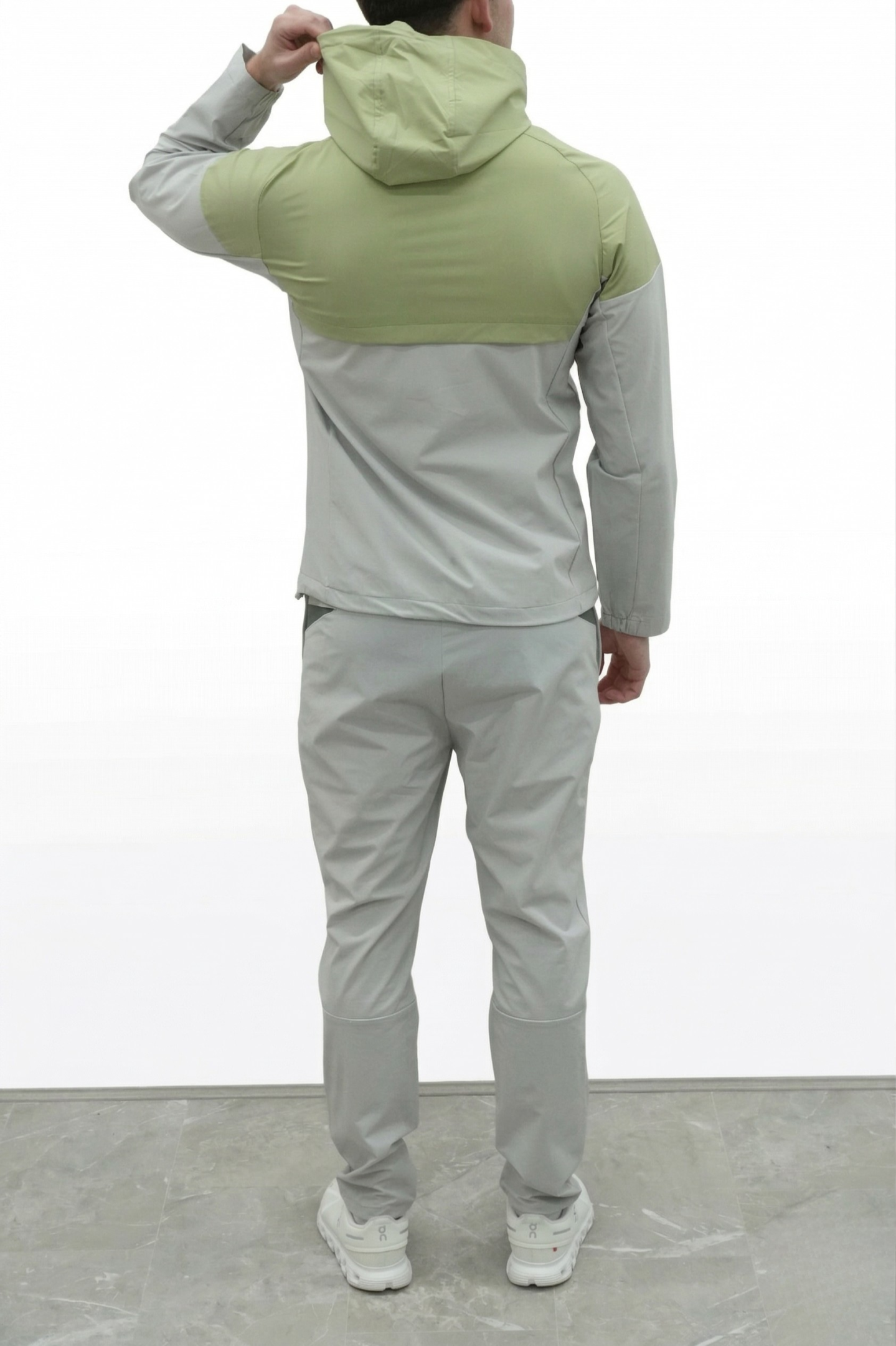 The jacket features a modern chevron design with a full-zip front and a secure chest pocket for your phone or AirPods while you’re on the go. Its adjustable hood provides extra coverage for outdoor runs or breezy commutes. The matching joggers offer a streamlined tapered fit with an elastic waistband that ensures maximum comfort and a stay-put feel during any activity.