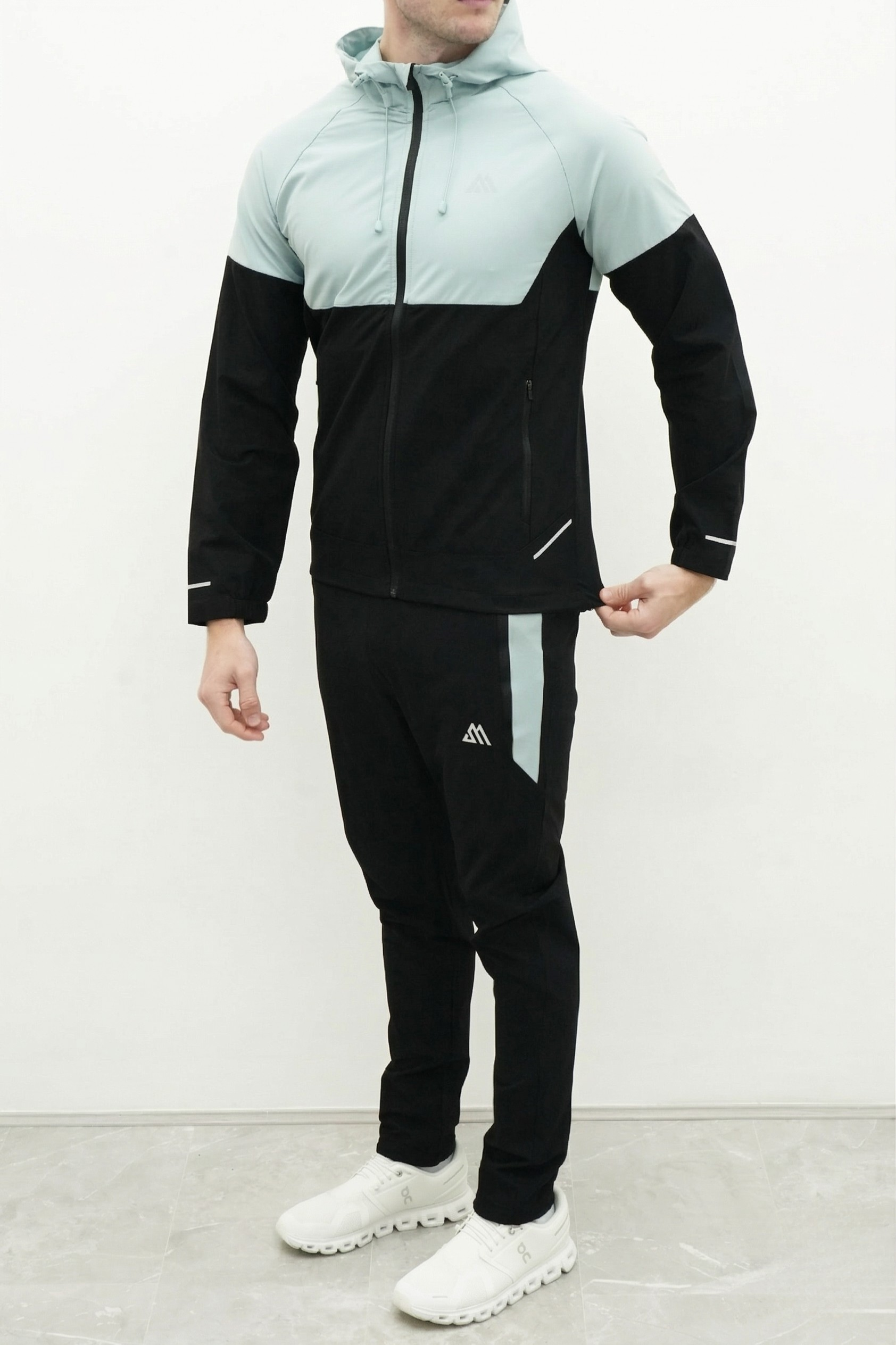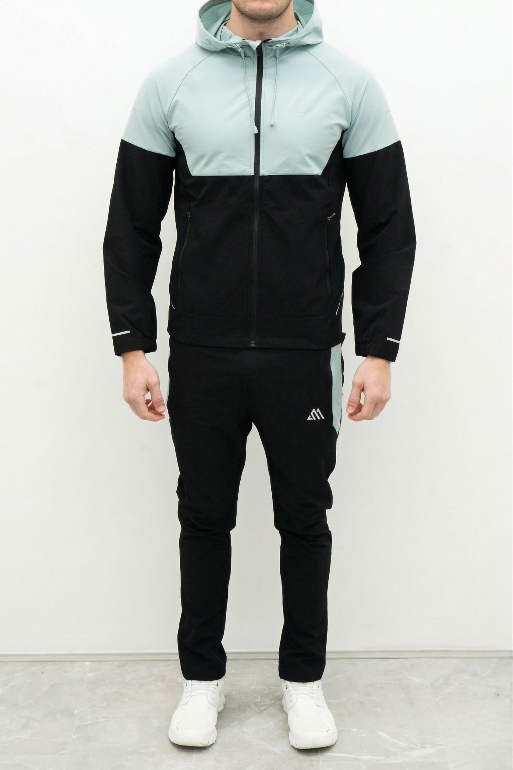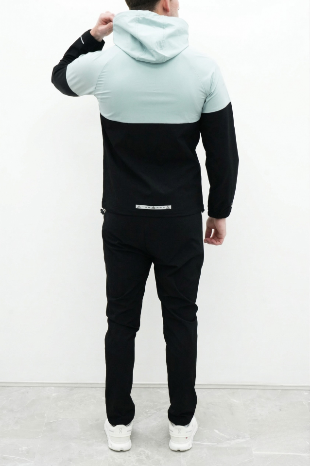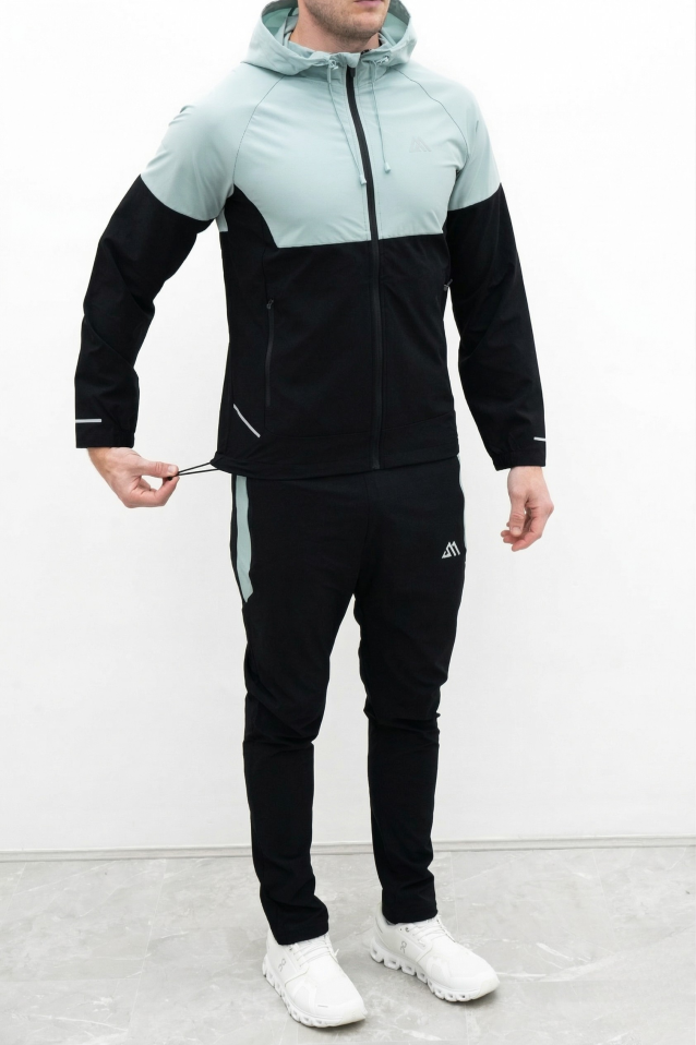 The windbreaker jacket is engineered with a lightweight weather-resistant fabric and a full-zip front for easy layering. It features an adjustable toggle hood to protect you from the elements and secure side zip pockets to keep your phone and keys safe during high-speed movements. The matching trousers are designed with a tapered fit and an elastic drawstring waistband to provide a secure custom feel. Contrast paneling on the jacket and side-stripes on the joggers create a coordinated pro-athlete aesthetic that stands out in any setting.