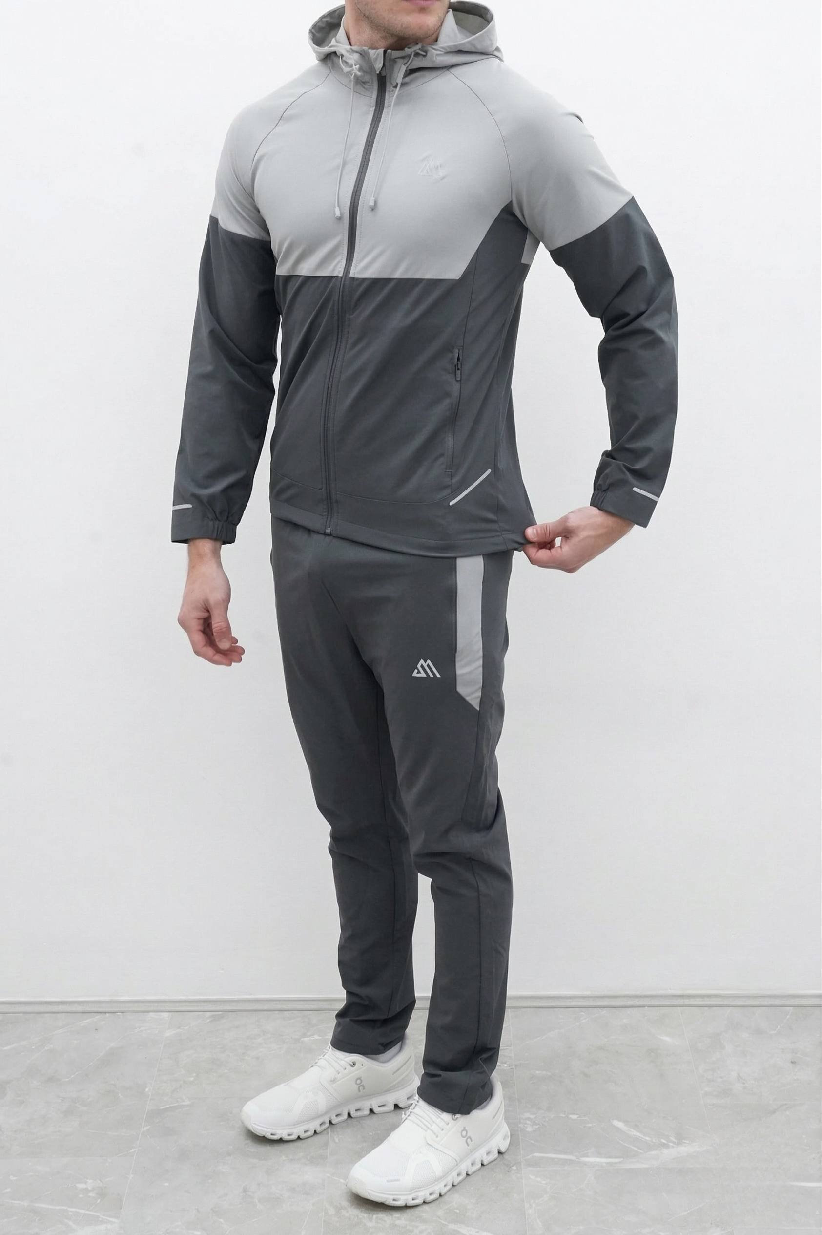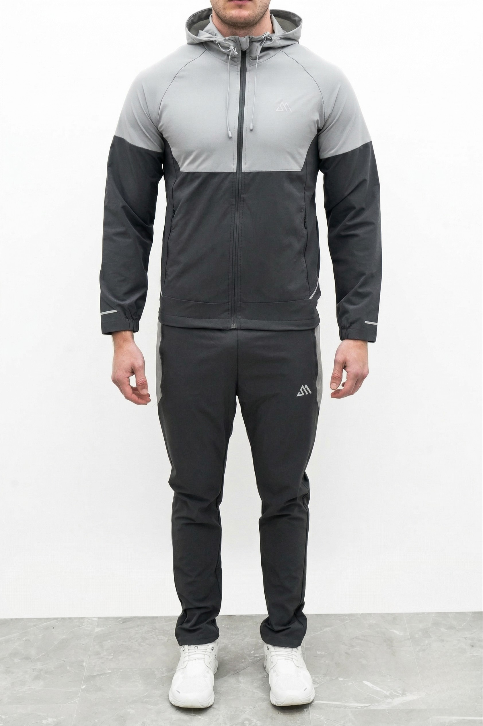 The windbreaker jacket is engineered with a lightweight weather-resistant fabric and a full-zip front for easy layering. It features an adjustable toggle hood to protect you from the elements and secure side zip pockets to keep your phone and keys safe during high-speed movements. The matching trousers are designed with a tapered fit and an elastic drawstring waistband to provide a secure custom feel. Contrast paneling on the jacket and side-stripes on the joggers create a coordinated pro-athlete aesthetic that stands out in any setting.