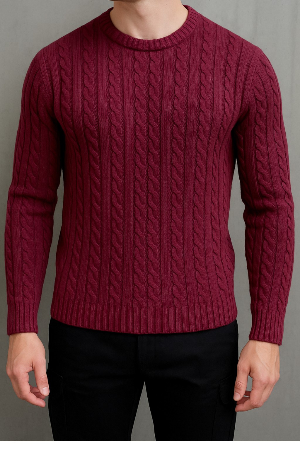 Round-Neck Cable Knit Wear in Burgundy